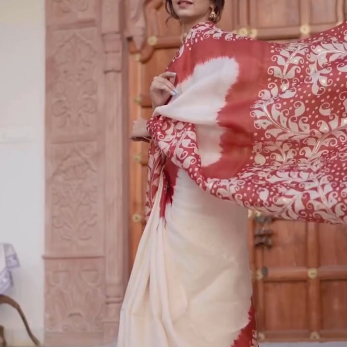 The classic red and white palette of this batik saree highlights traditional craftsmanship. The patterns have striking visual appeal. The saree drapes fluidly, making it ideal for special occasions and festive gatherings.