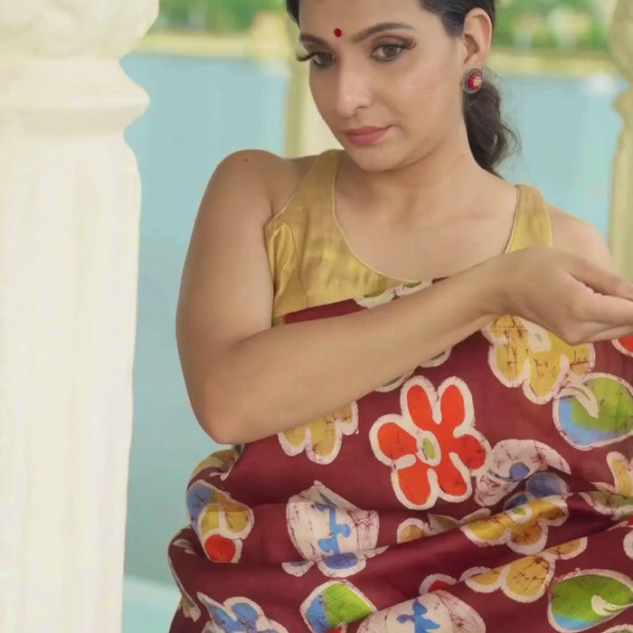 This Batik Saree is made of pure handloom silk, which is soft and luxurious to the touch. The batik artwork is done in traditional style. The designs really come to life when the saree is draped.
