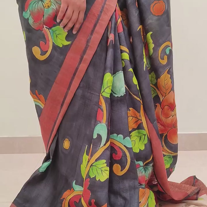 Please note that this is not pen kalamkari. Our sarees have kalamkari inspired artwork completely handpainted on them using fusion techniques with premium silk dyes. We do thorough processing of the sarees to ensure the colors don’t come off.