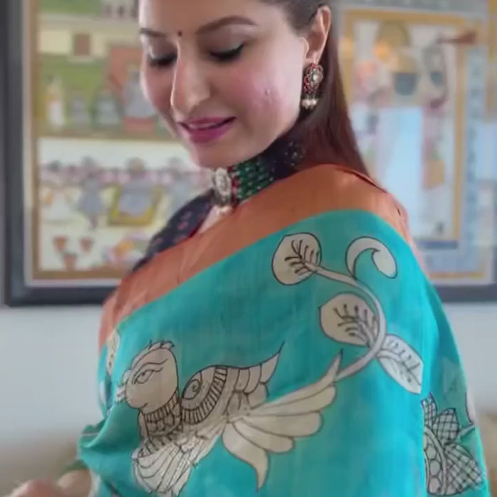 Each kalamkari saree in our collection features premium fabric. It feels soft against the skin and drapes beautifully. The vibrant blue and earthy orange tones make this kalamkari saree an eye-catching choice for any event.