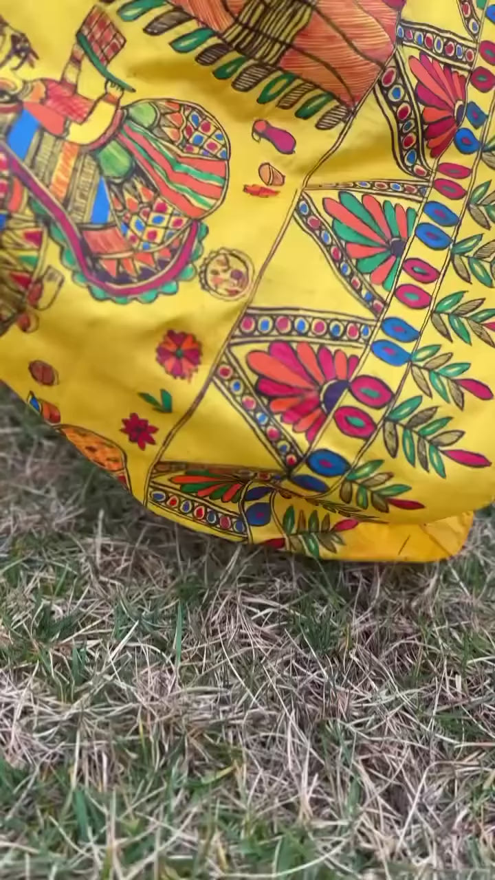 Bat Savitri Madhubani Saree showcases hand-painted patterns inspired by tradition. Each detail tells a unique story. The deep yellow fabric is smooth and comfortable. The intricate designs add life to every fold.