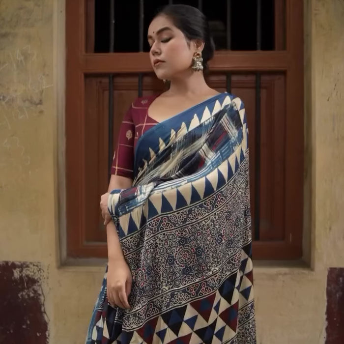 Step into timeless style with the Bandh Ajrakh Saree from Kawaii. This unique piece brings together tradition and elegance. The patterns stand out with deep blue tones and earthy reds. The fabric feels soft against the skin.