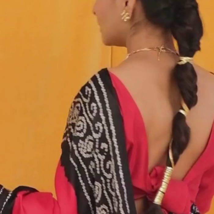 Made from luxurious silk fabric, the Swarnim Bandhani Saree features intricate bandhani tie-dye patterns, meticulously hand-tied by skilled artisans. Each vibrant hue is carefully selected to create a mesmerizing tapestry of colors, evoking a sense of celebration and joy.