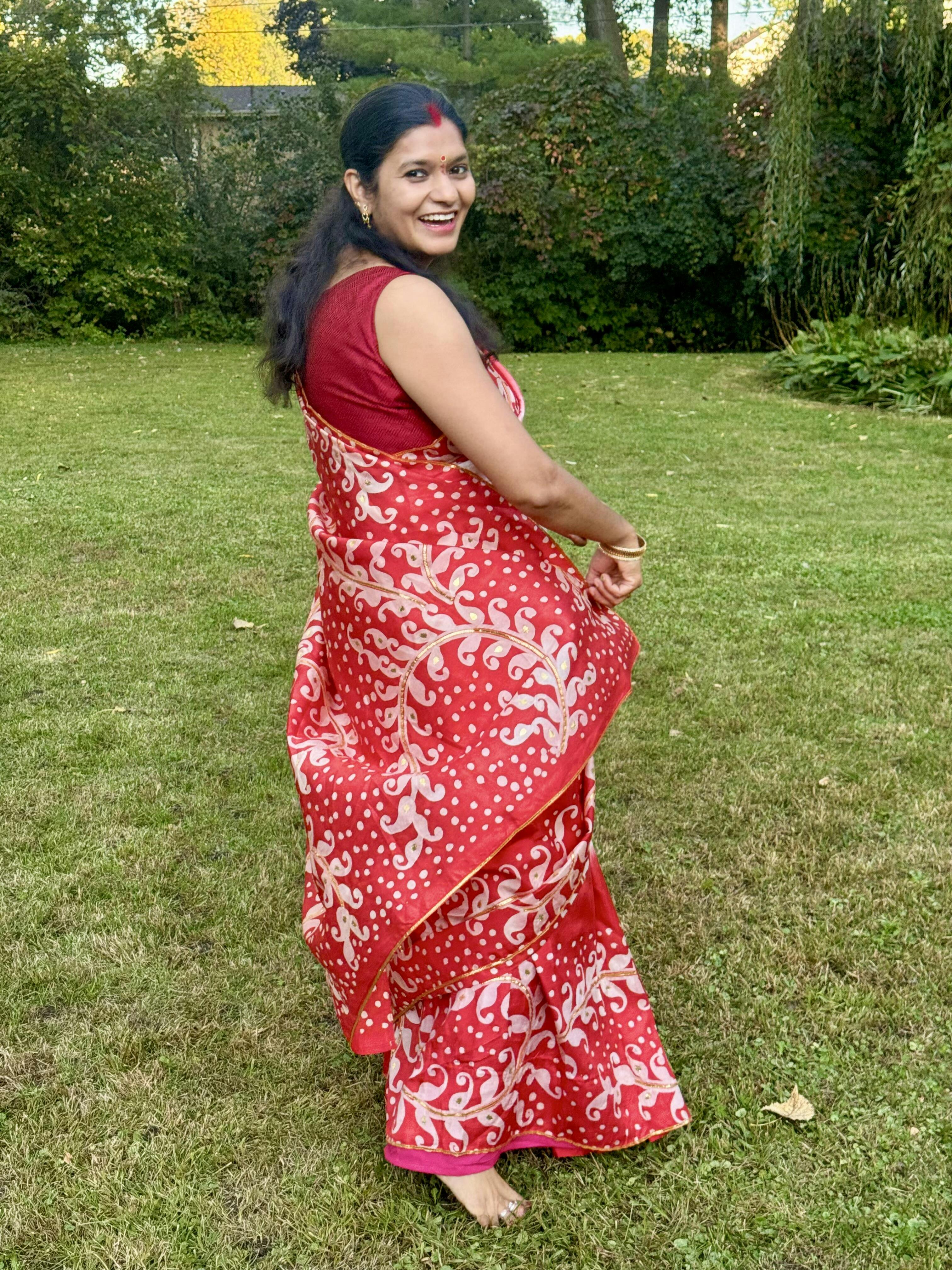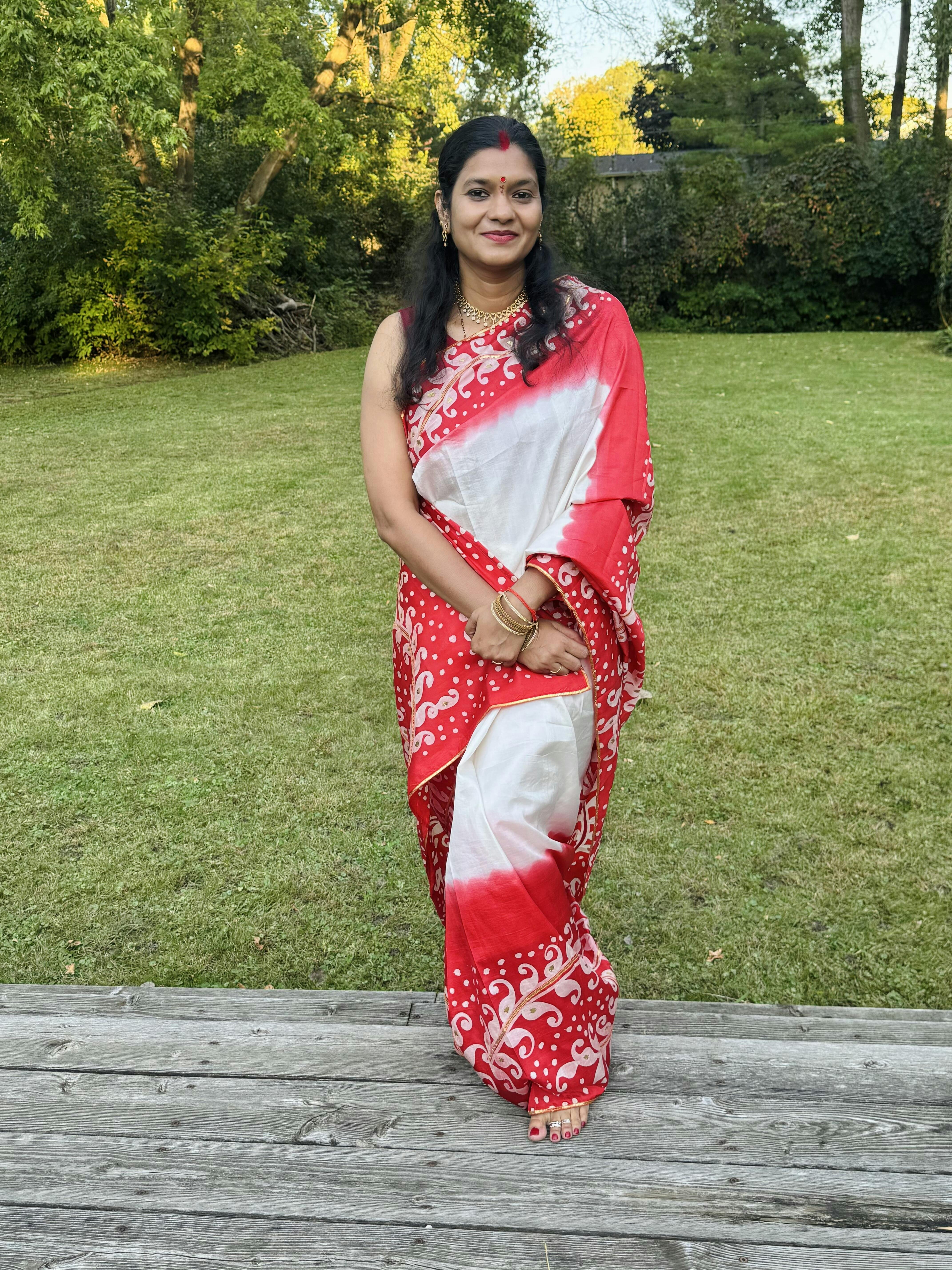 The classic red and white palette of this batik saree highlights traditional craftsmanship. The patterns have striking visual appeal. The saree drapes fluidly, making it ideal for special occasions and festive gatherings.