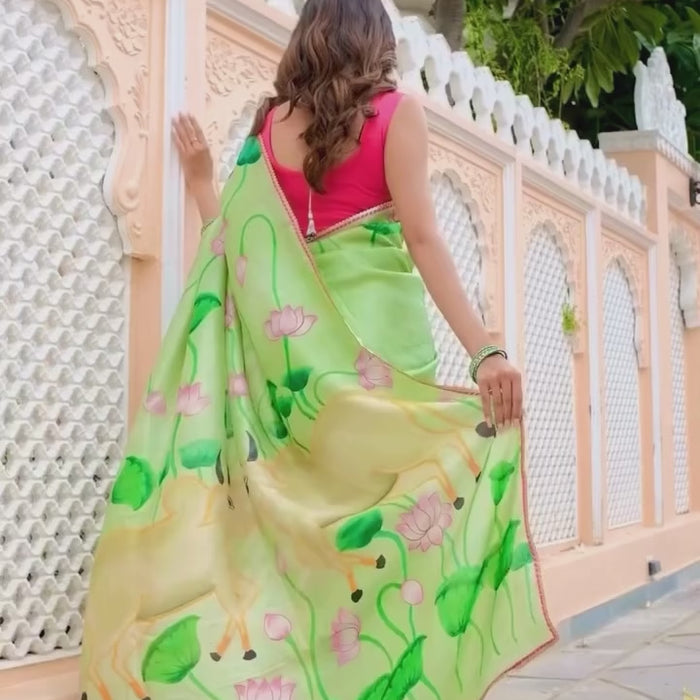 The handpainted cows on the pallu are a symbol of prosperity and good luck. The cows are also sacred in Hinduism, and they represent the divine feminine. Wearing this saree is a way to connect with the beauty and traditions of India. Beautifully designed pink lotus embraces the green of the saree.