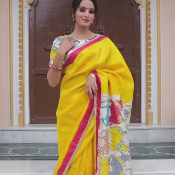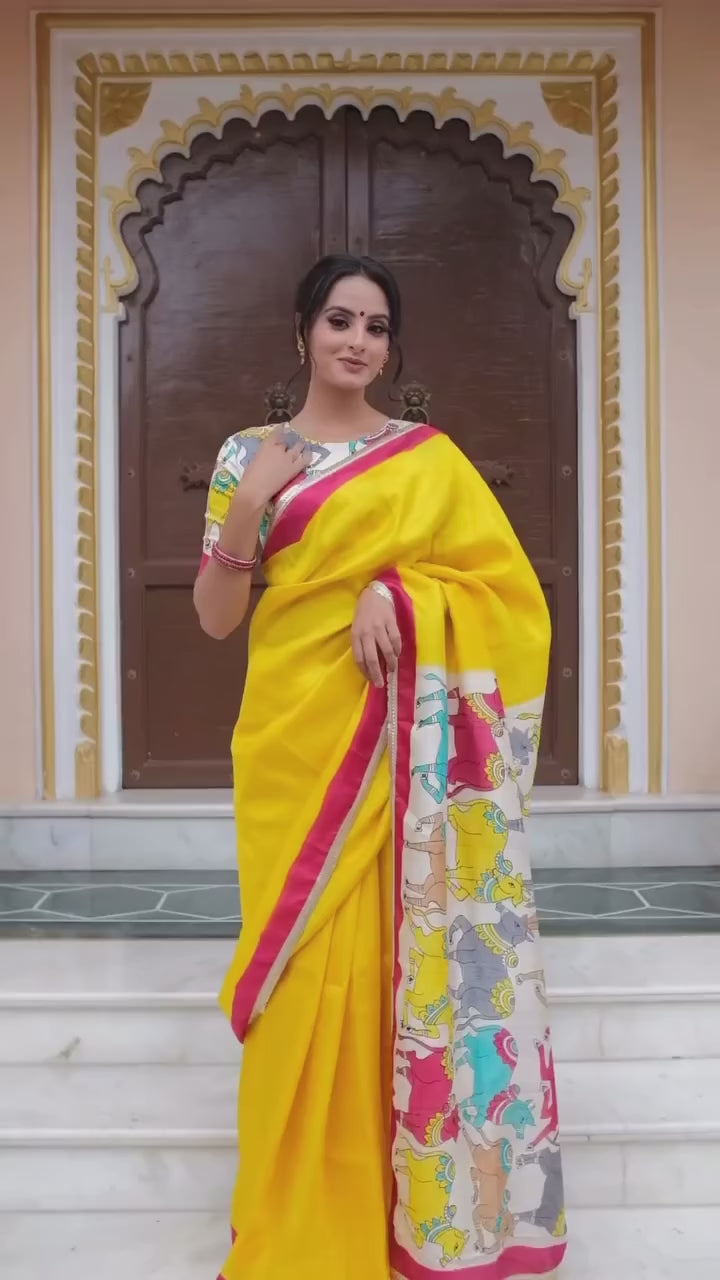 You simply can’t resist imagining yourself draped in a dreamy Pichwai saree, the soft silk caressing your skin as you move. The handpainted cows on the pallu and blouse are a work of art, their gentle eyes and serene expressions bringing a sense of peace and tranquility. The handpainted cows are a symbol of prosperity and good luck. The process of handpainting the cows is delicate and time-consuming that requires great skill and artistry.