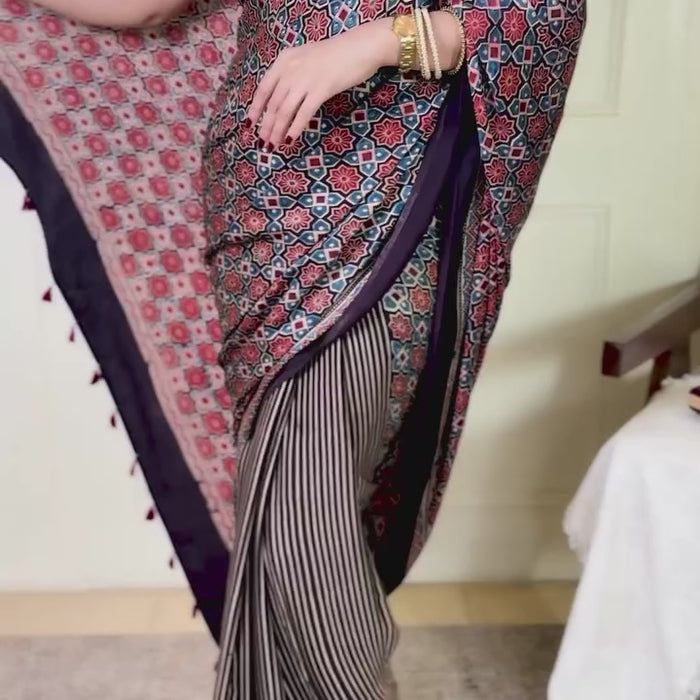 Crafted on pure modal silk, Taamara is the best authentic ajrakh saree carrying meticulously hand-blocked patterns that radiate from every inch, with motifs inspired by the geometry of nature and the cosmos. Its deep blue hues are offset by a rust-and-onyx border, and paired with a stunning contrast blouse that echoes the age-old elegance of Ajrakh but with a contemporary neckline.