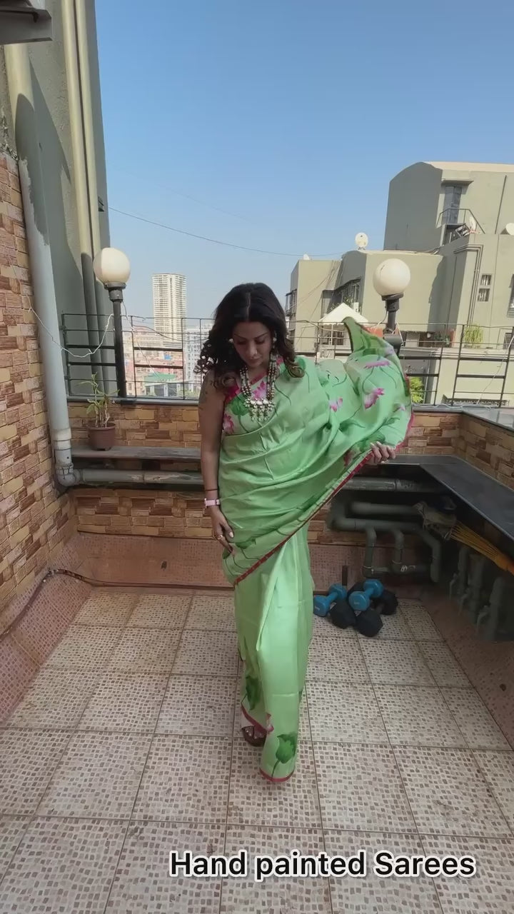 The handpainted cows on the pallu are a symbol of prosperity and good luck. The cows are also sacred in Hinduism, and they represent the divine feminine. Wearing this pichwai saree is a way to connect with the beauty and traditions of India. Beautifully designed pink lotus embraces the green of the saree.